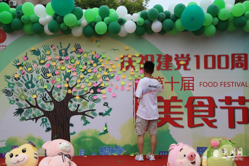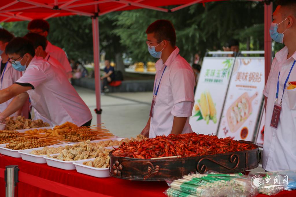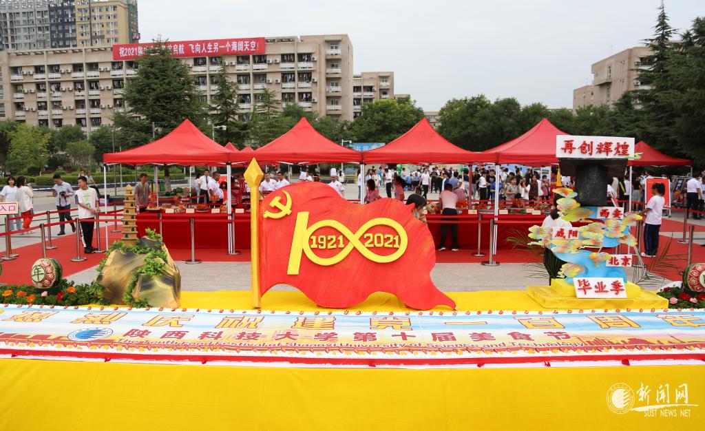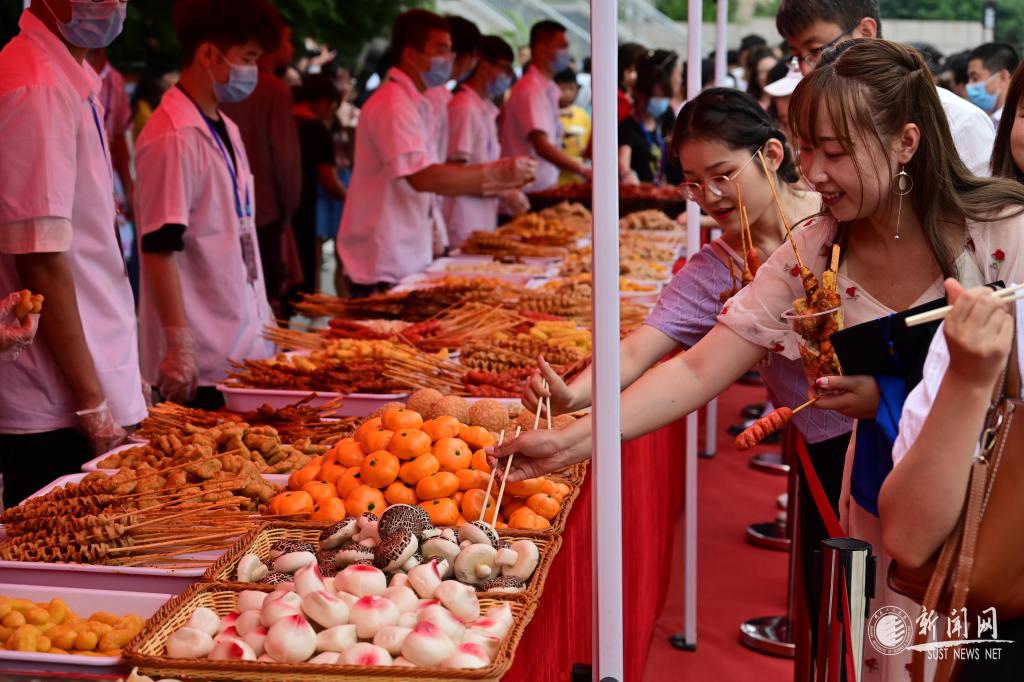 活动现场一片欢腾,师生们观赏烹饪技艺、品尝特色美食,感受陕科大特色饮食文化。进入活动区域,首先映入眼帘的是现场制作的“热烈庆祝建党一百周年”蛋糕,庄严而喜庆,整个蛋糕长10米,可供6250名师生享用。在观赏区,孔雀开屏、金鸡报晓、鸟语花香、金玉满堂等雕刻作品栩栩如生,彰显了中华美食文化的博大精深,展示了厨师们的精湛技艺。品尝区的各种热菜、西点、小吃、烧烤、水果、饮料,一应美食琳琅满目,吸引得师生们早早地排起了长队。在互动区,免费抽奖台前人头攒动,奖品有玩偶、小风扇、饮料、餐券等。活动现场,后勤工作人员和学生志愿者们有条不紊地分发餐具和食物、兑换小奖品、维持现场秩序,现场热闹而有序。学生代表献唱了《我和我的祖国》《绣红旗》等合唱和独唱歌曲,将现场气氛一次次推向高潮。