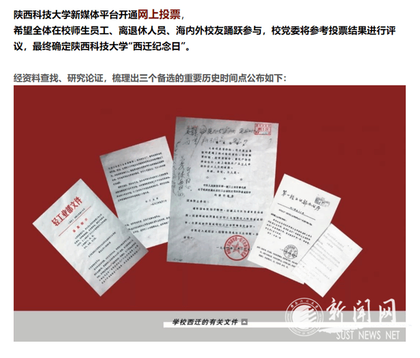 宣传践行“三创两迁”大学精神,加强新闻策划,贴合师生特色,努力推出有思想、有温度、有品质的作品。甲子校庆期间,推送《60周年校庆标识出炉,请选出你认为最好的方案》、歌曲改编《陕科大版“等你下课”、“慢慢喜欢你”》、《60个SUST的记忆故事》等图文,其中《换上SUST专属头像框,赢观微礼品,为母校庆生》活动图文一经推出,不到一周的时间上万人纷纷更新自己的头像,为母校庆生。在宣传“三创两迁”大学精神,持续深化向张美云同志学习活动中,搭建微信小程序,举办“陕科大三创两迁达人赛”线上活动,并推送《科大青年》、《视说》系列,报道师生榜样事迹,凝聚正能量,做好网络文化的“精神导线”和“有声纽带”。