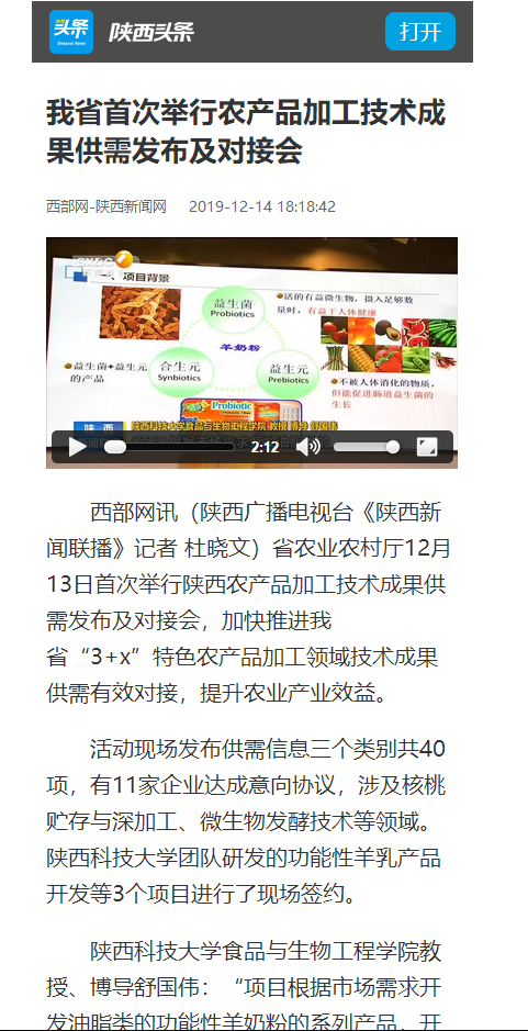 近日,陕西日报、陕西头条、陕西省农业农村厅官微等媒体纷纷报道了金沙官网2019陕西农产品加工技术成果供需发布及对接会顺利召开。